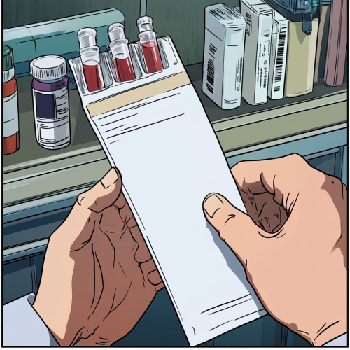 A comic book page in a realistic cartoon style with flat colors. The close-up image focuses on a lab test result paper being held by a doctor’s hands. The details of the paper are partially visible, showing medical symbols and data, but the emphasis is on the doctor's grip and the flat color style. The background is simple and muted, keeping the focus on the hands holding the test results.