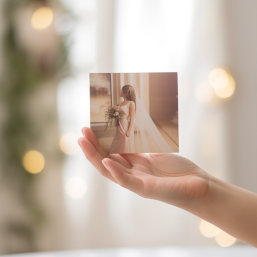 a close up of a blank 5 inch by 7 inch card, one woman’s hand holding it. Background blurred a modern pastel wedding. bright natural lighting. --v 5.1