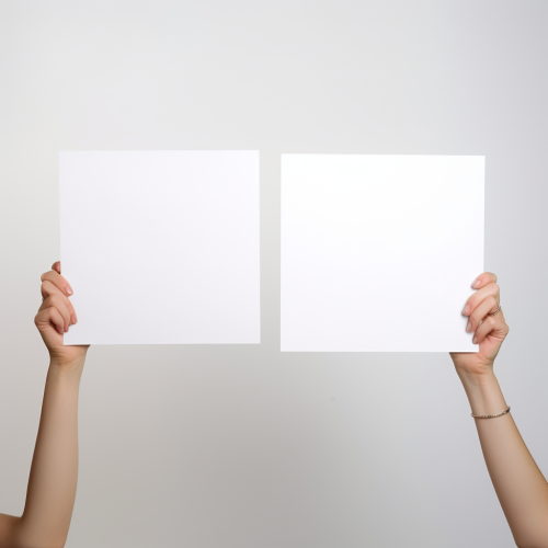 White background, close-up photo of both hands holding A4 paper horizontally high, no background