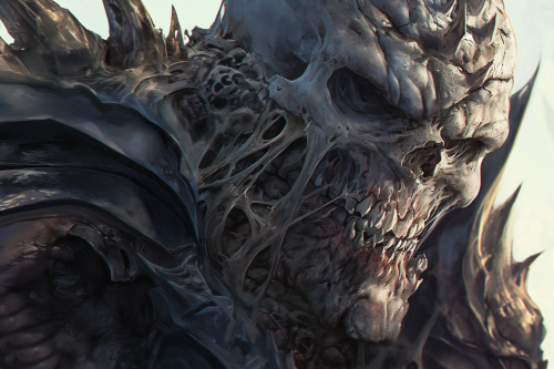 close up of face of giant muscular monster with a bone exoskeleton armor and a evil skull head + horror + art style of Capullo, Brom, Whelan, aly fell rutkowski, art germ, rossdraws, and franzzeta + art station + ultra detailed + hyper realistic + 8k --ar 3:2 --niji 6