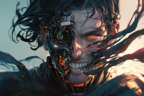 Close-up man with cybernetic face in realistic horror art