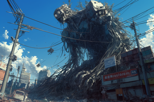 a god-like giant cybernetic man made of wires and metal crashing into a building to the ground + horror + art style of Capullo, Brom, Whelan, aly fell rutkowski, art germ, rossdraws, and franzzeta + art station + ultra detailed + hyper realistic + 8k --ar 3:2 --niji 6