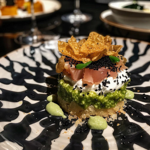 a fun and elegant dish consisting of kettle cooked salt and vinegar chips, with a creme fraiche tuna tartare dip, bright green wasabi, and dark black tobiko