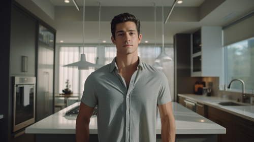 portrait of a man with dark hair looking directly back at the camera in centerframe from the shoulders up in a generic high-rise modern apartment kitchen with natural daylight --ar 16:9