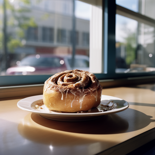 kodak 400 portrait of cinnamon roll, freshly baked, coffee shop background, natural sunlight and shadow, high resolution