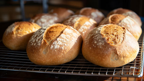 Golden brown loaves of bread, freshly baked, with a crisp crust, taken out from a oven --ar 16:9
