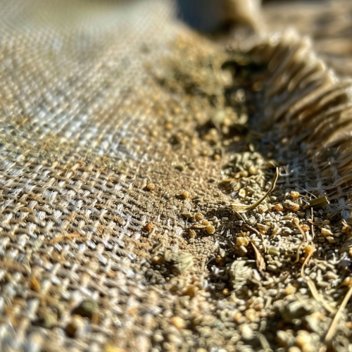 close-up, zoomed-in image of a hemp fabric with no wrinkles, that is infused with bits of catnip