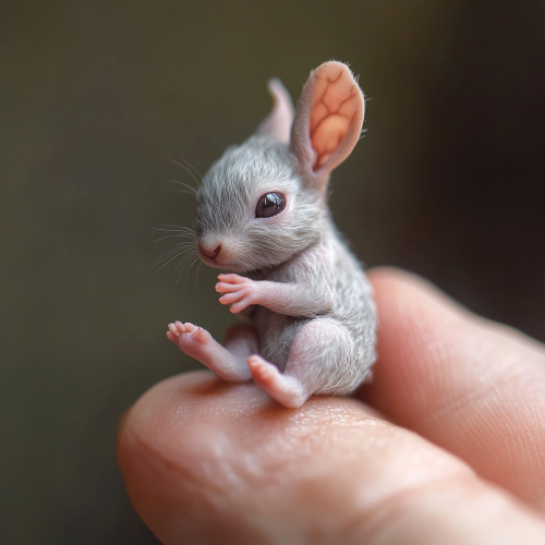 Photorealistic macro shot of a miniature newborn 【Rabbit】 perched on a human's thumb. Extreme close-up emphasizing the infant 【Rabbit】's delicate features: wrinkled gray skin, oversized expressive eyes, and wisps of soft fur. The tiny creature clings to the thumb with its minuscule feet. Sharp focus on the 【Rabbit】 with a shallow depth of field blurring the human hand, accentuating the dramatic size difference. Studio lighting for crisp detail and textures.
