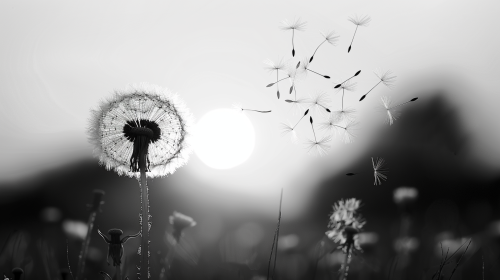 a close up photo of dandelion with the seeds blowing away golden hour - very short focal length, blurry background, black and white, low angle --ar 16:9 --v 6.0 --s 250
