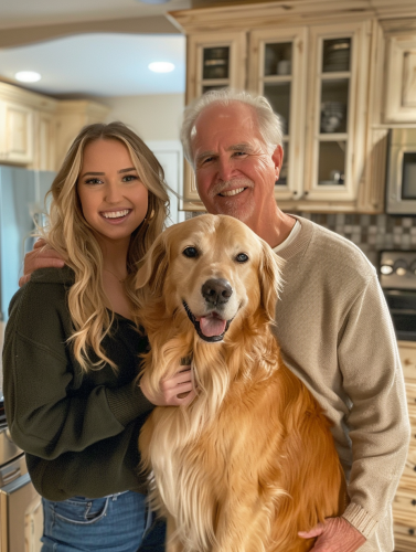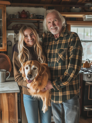 iPhone photo of a 18 year old supermodel holding an old golden retriever standing next to her 38 year old dad in the kitchen --v 6.0 --ar 3:4 --style raw