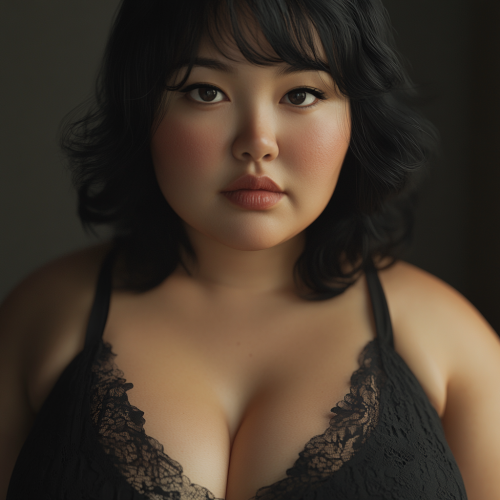 A lifelike image of a 28-year-old woman, black hair, chubby body, upper body visible from the head to below the chest, direct eye contact with the camera. Realistic textures in skin and hair, balanced lighting with slight shadows for depth, detailed portrayal of expression, hd quality, natural tone and colors, Fujifilm GFX 100, 110mm lens, f/2.0 aperture --style raw