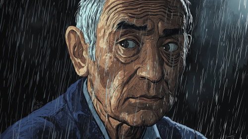 A comic art style close-up portrait of elderly Raif from 'Madonna in a Fur Coat' by Sabahattin Ali, set in 1940s Turkey. 16:9 aspect ratio, focusing on Raif's aged face and upper shoulders. Raif is a Turkish man in his late fifties or early sixties, with a calm, innocent gaze directed slightly upward, as if lost in a bittersweet memory. Weathered but gentle facial features that speak of a life lived with quiet dignity. Soft, kind eyes that hold a glimmer of youthful innocence despite the passage of time. Subtle crow's feet around his eyes, from both quiet smiles and unspoken sorrows. A straight nose with slight aging signs. Thin lips formed into a faint, serene smile tinged with melancholy. Cheeks with natural aging lines, not sunken but carrying a hint of life's burdens. A jawline that's softened with age but still defined. Silver-grey hair, neatly combed but with a few errant strands, suggesting a touch of lingering spirit amidst resignation. Clean-shaven face, emphasizing his innate gentleness. Noir-style lighting with a soft, diffused light source coming from the side, creating gentle yet pronounced shadows that accentuate the contours of his face. Dominant cool blue and grey tones with sparse warm highlights, creating a melancholic atmosphere. Refined outlines, pronounced halftone effects in the shadowed areas of his face and neck, maintaining the comic book style while emphasizing the somber mood. High contrast between light and shadow to highlight his features and the depth of his emotions. Raif is wearing a comfortable, well-worn cardigan in muted tones, visible at the bottom of the frame, suggesting both comfort and the passage of time. A faint reflection in his eyes of a rain-streaked window, hinting at him gazing out at a gloomy day. Subtle motion lines [...]