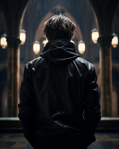 A portrait of a faceless young man, gothic church background, peaceful pose, the faceless young man is wearing a dior jacket style, detail relevance, wet ambience, dark atmosphere, realistic style, extreme close-up shot, nice composition, high resolution, --ar 4:5