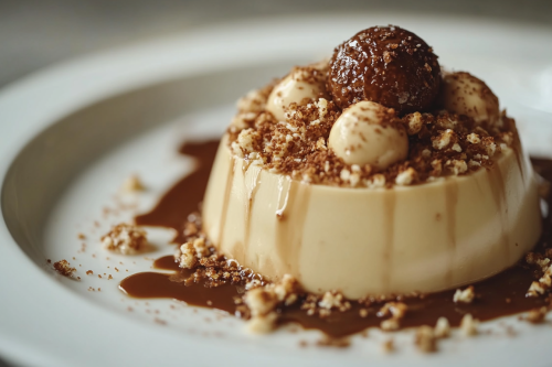 STYLE: Close-up Shot Top view | EMOTION: Tempting I SCENE: TRANCHE Cuajada au Yaourt | TAGS: High-end food photography, clean composition, dramatic lighting, luxurious, elegant, mouth-watering, indulgent, gourmet | CAMERA: Nikon Z7 | FOCAL LENGTH: 50mm | SHOT TYPE: Close-up | COMPOSITION: Top view Centered | LIGHTING: Soft directional light | PRODUCTION: Food Stylist --ar 3:2