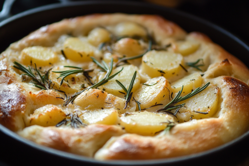 STYLE: Close-up Shot Top view | EMOTION: Tempting I SCENE: Wild Confit Garlic Rosemary FocacciaFocaccia, with rosemary and potatoes on top in the oven pan. The bread is light golden brown and has visible bubbles throughout its surface. It features large markings falling from one side of its center to another, adding depth to its appearance. There's some misting around the edge that adds an elegant touch. This dish appears rich yet simple, perfect for those who love rustic shapes or like their food lightly crusty | TAGS: High-end food photography, clean composition, dramatic lighting, luxurious, elegant, mouth-watering, indulgent, gourmet | CAMERA: Nikon Z7 | FOCAL LENGTH: 50mm | SHOT TYPE: Close-up | COMPOSITION: Top view Centered | LIGHTING: Soft directional light | PRODUCTION: Food Stylist --ar 3:2