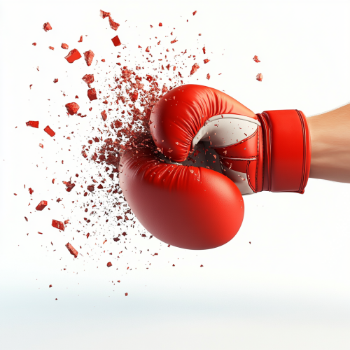 front view of hand in boxing glove doing a hit with force, bits flying around, front view perspective, glove hitting screen 3d effect, white background