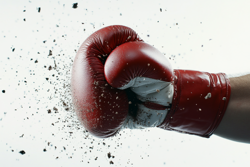 front view of hand in boxing glove doing a hit with force, bits flying around, front view perspective, glove hitting screen 3d effect, front of the glove, pov perspective, white background --ar 3:2
