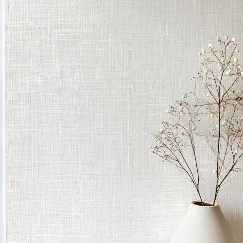 A close-up shot of a white hallway wall, focusing on a rectangular section where the wallpaper can be inserted. A narrow console table with a few minimal decor pieces, like a single book or a geometric sculpture, is partially visible in the background, subtly blurred to maintain focus on the wallpaper. The soft lighting accentuates the wallpaper’s design and texture, creating a clean and modern aesthetic.