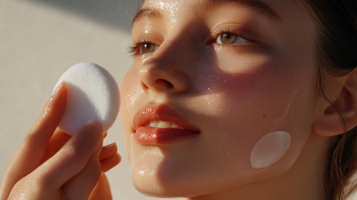 A high-quality, close-up photograph of a woman's face during a skincare routine, emphasizing gentle cleansing. The woman has glowing, healthy skin and is delicately using a soft cotton pad with micellar water to remove makeup, avoiding any harsh rubbing. Nearby, there are natural skincare products like an oil cleanser and a milk cleanser, presented in elegant, minimalistic packaging. In the background, discarded makeup wipes are visible, symbolizing the harmful practices discussed in the article. The lighting is soft and warm, creating a soothing, clean atmosphere that reflects the theme of gentle skincare and skin protection. --ar 16:9
