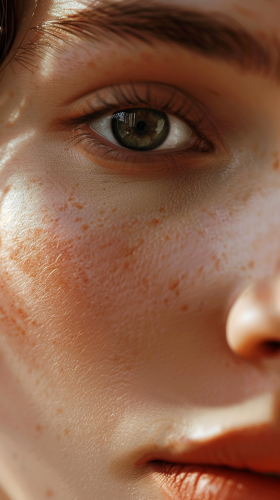 Close-up of a clear, glowing complexion with no blemishes or imperfections. The skin looks healthy and radiant under soft, natural lighting to emphasize its clarity., cinematic background and lighting, realistic, --ar 9:16 --relax