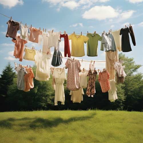 highly detailed photorealistic watercolor clothesline on which beautiful clothes are dried, white color, soft colors, beautiful illustrations with realistic details, luxurious aesthetics, high resolution, gray background