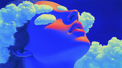 Surrealistic style, a woman's head is covered in clouds, with three white cotton pads on the forehead and face, white clouds float in front of his eyes, with slines, smooth curves, and geometric shapes --ar 16:9 --sref 680572301::1 3322162017::1 1557150497::2 --sw 500 --stylize 1000