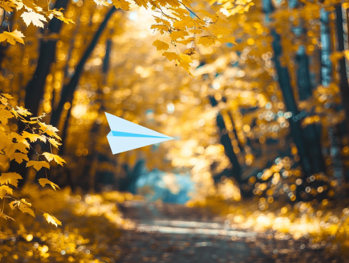 imagine an autumn forest, all in yellow foliage, in the middle of the forest a large Telegram application icon, in the form of a white paper airplane on a blue icon, --ar 4:3 --v 6.0