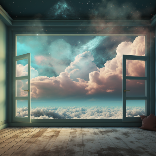 a realistic image in high resolution of a room with no furniture but a window with a view of the cosmos and some clouds