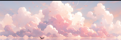 A cute cloud themed landscape, angelic, pink colors, by C. M. Kosemen, Christian Cline and Wayne Barlow --stylize 150 --niji 5 --ar 3:1