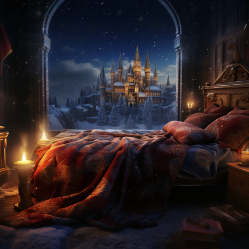 comfortable bed, magic, warm, Hogwarts style, Ravenclaw dormitory, snow, night, --ar 3:4