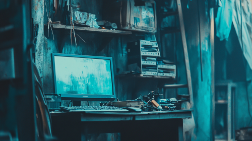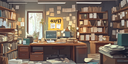 Create a detailed scene of a 'Lost Files Desk' where all the 404 error pages are gathered. The setting is a quirky, cluttered office with stacks of misplaced documents, dusty old computers, and scattered paperwork everywhere. The desk has a sign that reads '404 Lost & Found,' and a weary-looking office worker or librarian is trying to organize the chaos. The environment should have a humorous and whimsical vibe, with digital files floating around and a sense of playful disorder. --ar 2:1