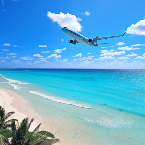 a photo of an airplane flying to Florida with a white sandy beach and blue ocean below