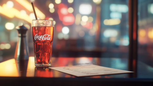 Hyper realistic photo of a menu card sponsored by Coca Cola on a table. 75 mm lens, production quality, depth of field, cinema photography, color grading, exquisite detail, sharp-focus, intricately-detailed, long exposure time, f/2.8, diffuse-back-light, award winning photography, hyper realistic, unreal engine, realistic lense flare, Cinematic Lighting, Studio Lighting, Beautiful Lighting, Accent Lighting, Global Illumination, Ray Tracing Global Illumination, Ray Tracing Reflections, Lumen Reflections, Screen Space Reflections, Anti-Aliasing, FKAA, TXAA, RTX, SSAO, Shaders , OpenGL-Shaders, elegant, 4K, --ar 16:9
