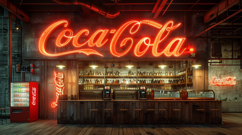 Coca-Cola animation set-up, kiosk with touch screen, set design like an art gallery, cement wall background, parquet flooring, wood, raw materials, glassy, predominantly Coca-Cola red, Coca-Cola neon signage --ar 16:9 --stylize 1000