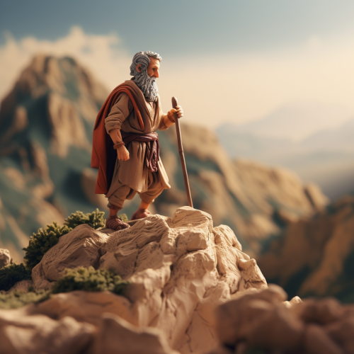 Stop motion animation of a ancient roman philosopher going on an adventure across a mountainous landscape, made of clay
