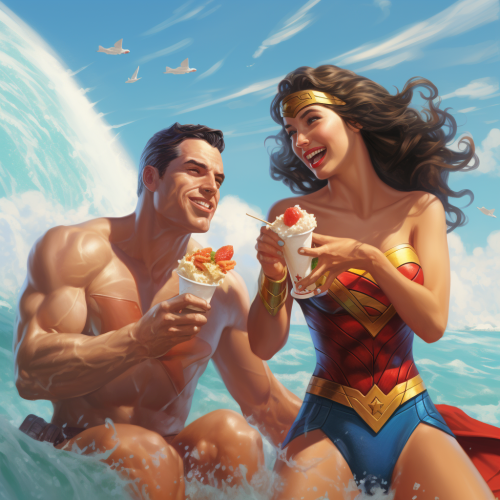 Adventurous Background. Young Wonder Woman and young Superman fighting over Ice Cream.