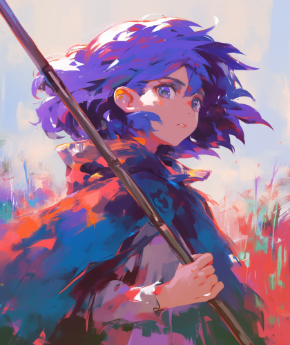 an anime girl wearing a blue coat holding a long stick, in the style of goblincore, light red and amber, brushstroke fields, folkloric portraits, adventure themed, digital art techniques, rtx on --ar 43:51 --niji 6
