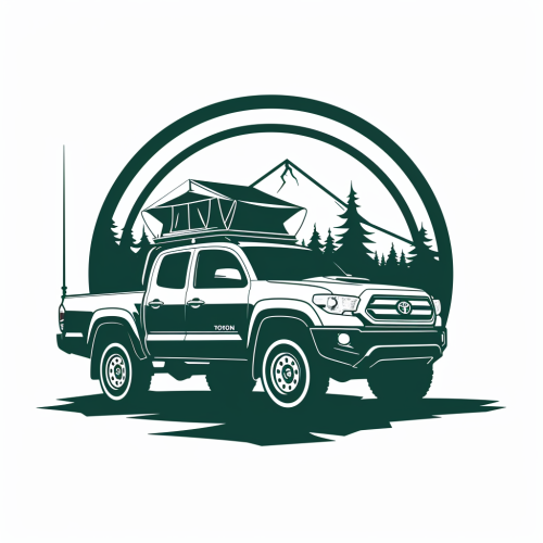 a one color vector logo on a white background, for the brand Brooklyn-Overland. Classic and adventurous and aimed at offroad community in dark green. the logo is designed in a circle badge like style. Incorporate elements that convey a sense of exploration, ruggedness, and the midway point of a journey. Atleast include a Toyota pickup truck with canopy and rooftop tent. Consider including symbols like mountains, trees. Ensure the design is scalable, versatile, and visually appealing. Emphasize the spirit of adventure and the company's commitment to providing memorable off-road experiences. --v 6.0