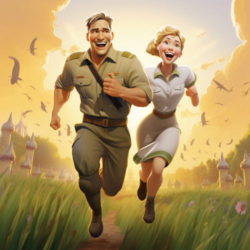 Disney Pixar movie poster of a laughing couple (consists of a rugged white man in his thirties dressed as an adventurer and a young short-haired white woman in military uniform) running from a villain who looks like Kris Kristofferson and wears military clothing, the villain is chasing the couple