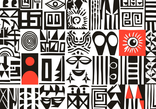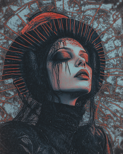 St. Lucy, an icon of the saint in the style of ancient Slavic style, featuring Roman mosaic patterns, designed in the style of Tim Burton with bold colors vector illustration with bold outlines and geometric shapes on a white background, in a flat design, suitable for use as a logo, sticker, clip art, or graphic printmaking, only red and gold colors, --ar 62:89 --q 2