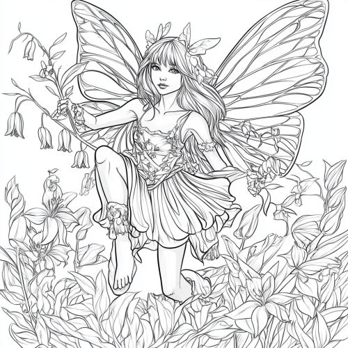 coloring page for kids, Fairy of the Bluebell flower,cartoon style, thick lines, low detail,no shading ,Dreamlike,Art style in the manner of a Tim Burton film, 9:11