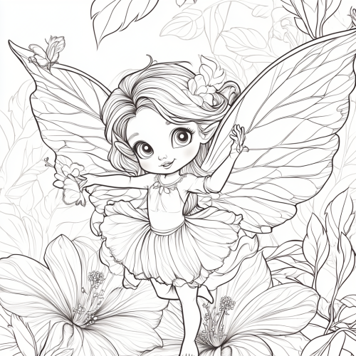 coloring page for kids, Fairy of the Hibiscus flower,cartoon style, thick lines, low detail,no shading ,Dreamlike,Art style in the manner of a Tim Burton film, 9:11