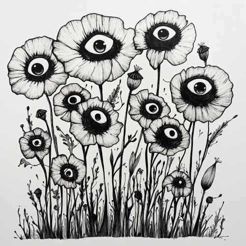 A drawing of poppy flowers with faces on them, simple ink lines, hand-drawn, simple, white background, high contrast, surrealism, black and white, ink wash, simple line art, cartoon style, in the style of Tim Burton --s 250