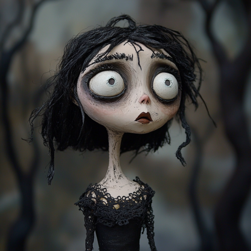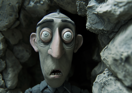 a man with no eyelids stares at a wall by himself in a cave. In the style of Tim Burton animation --ar 7:5 --v 6.0