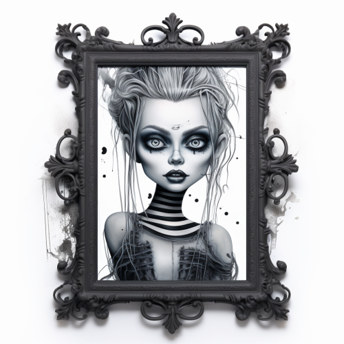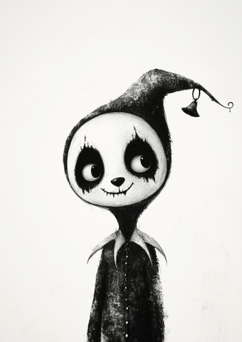 Create a whimsical, Tim Burton-inspired artwork featuring a single monocular (one-eyed) panda set against a plain white background. The character should evoke a playful and mysterious aesthetic with a jester-inspired design. The panda should be dressed in a minimalist, dark-themed jester outfit with black and dark accents, including a small bell-tipped hat and a few subtle motifs that reflect the character's quirky nature. The overall design should be simple yet striking, capturing a sense of whimsy and intrigue while focusing solely on the panda character, set against a plain white background. inspired by Tim Burton, set against a plain white background --ar 5:7 --s 250 --v 6.1