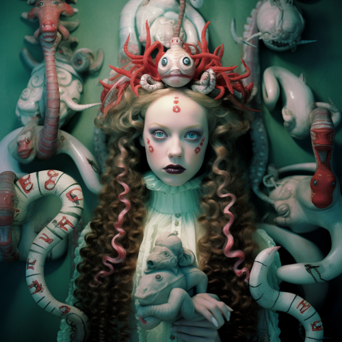 photographed with hasselblad he 100mm f/ 2.2, Mark Ryden + Tim Burton Style, vivid scenes, soft colors, interesting background imagery, most amazing photo of medusa
