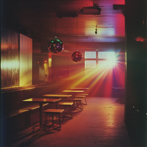wolfgang tillmans photograph, empty club, dreamy, surreal, maximalist, very busy composition, dark, mysterious, complex lighting, rainbow, post punk aesthetic