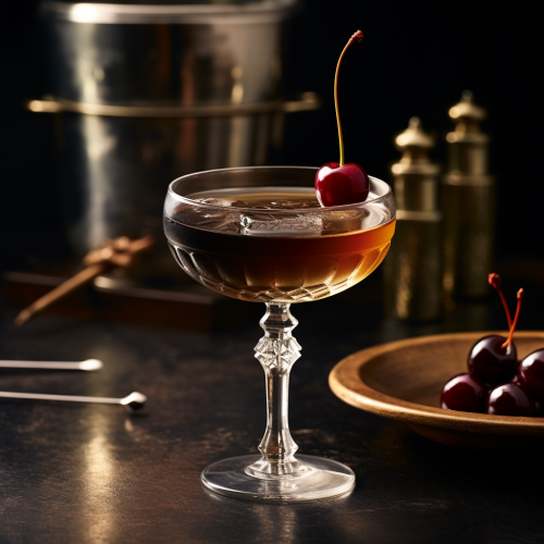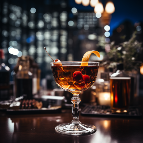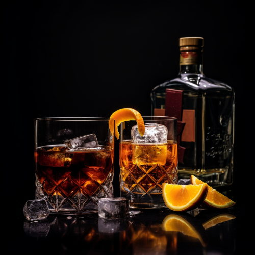 Side view, black background, wide photo, wide shot, very detailed, realistic photography, diffuse – back – lighting, two visually appealing cocktails, one old fashioned cocktail on the left in a traditional glass with one large square icecube, and a cosmopolitan cocktail on the right in a cosmopotan glass, the old fashioned cocktail has a small trail of smoke coming from it