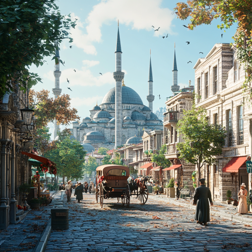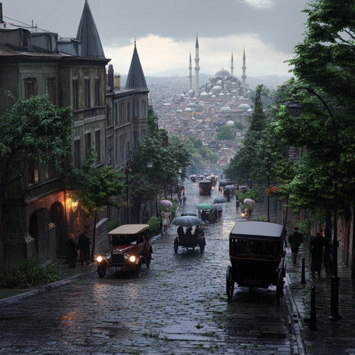 What Istanbul looks like past, fascinating, 1900s, imaginative, realistic, photographic of the city of Istanbul, background Istanbul city view, incredible, creative, tower 3d render, old Istanbul houses, old cars, old people, horse carriage, trees, rainy,people with umbrellas