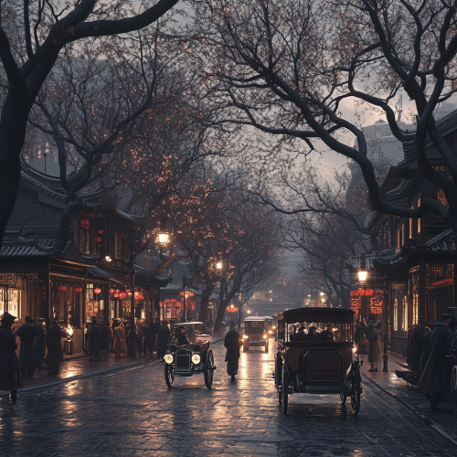 What Beijing looks like past, fascinating, 1900s, imaginative, realistic, photographic of the city of Beijing, background Beijing city view, incredible, creative, old street 3d render, old Washington houses, old cars, old people, horse carriage, trees,fun people, night